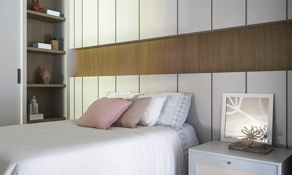 O aproveitamento inteligente do espaço é um dos principais diferenciais do dormitório planejado. O uso da altura total das paredes, profundidades adequadas, divisões internas bem distribuídas e a integração entre móveis permitem extrair o máximo do ambiente, inclusive em um quarto pequeno planejado. Além disso, o planejamento garante unidade visual, com cores, acabamentos e volumes que se complementam e criam uma sensação constante de ordem e conforto, fundamental em um espaço dedicado ao descanso.